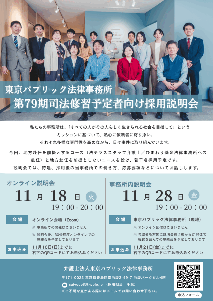 今回、地方赴任を前提とするコース(法テラススタッフ弁護士/ひまわり基金法律事務所への赴任)と、地方赴任を前提としないコースを設け、第79期司法修習予定者から若干名採用予定です。説明会では、当事務所のミッションや特徴についてご紹介しつつ、採用後の当事務所での働き方、待遇、採用スケジュールや応募要項についてご説明をいたします。